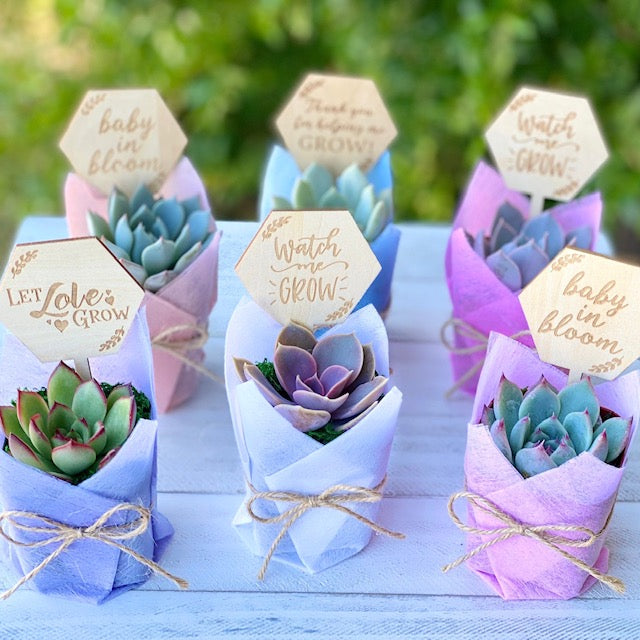 2" Succulent party favor in color wrapping of your choice with tags or signs