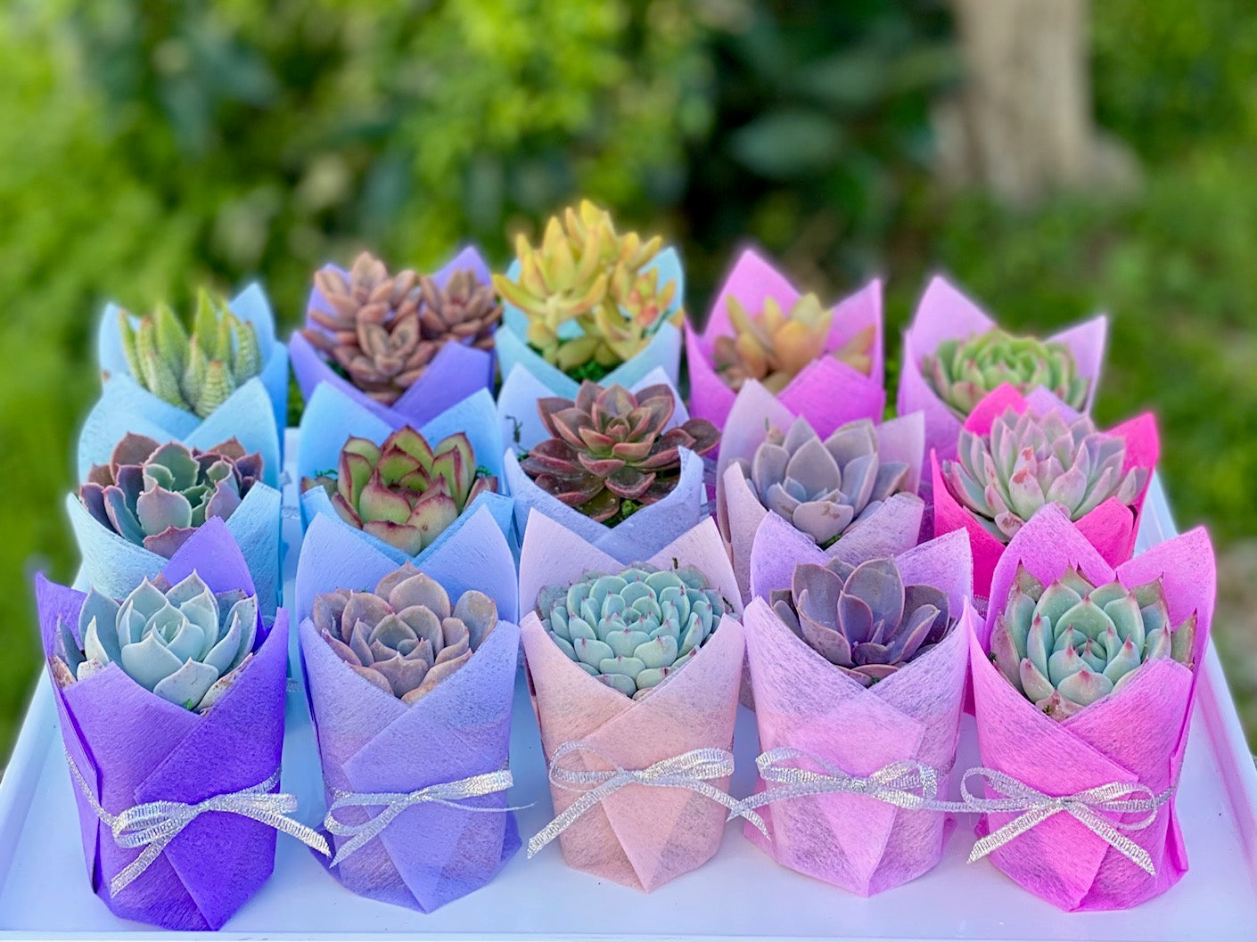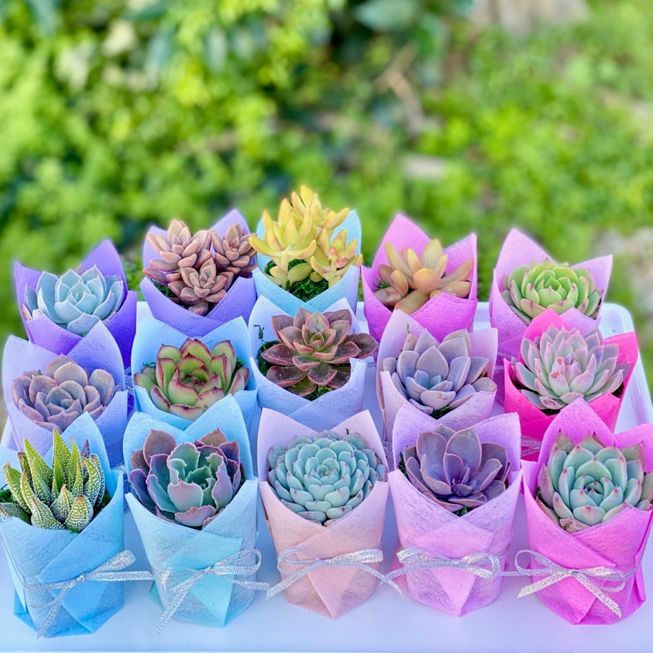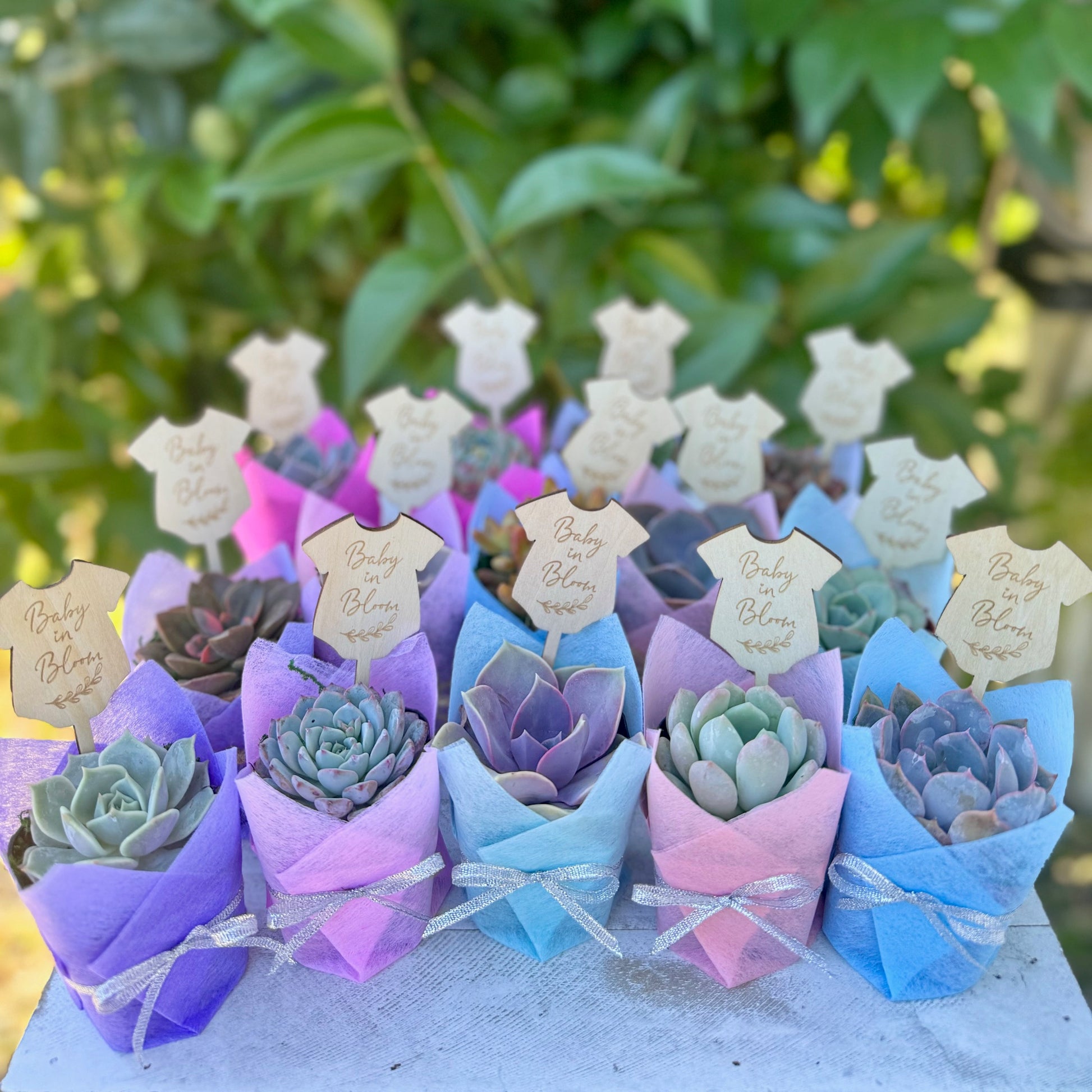 2" succulent in color wrapping of your choice with Baby in Bloom Onesie sign