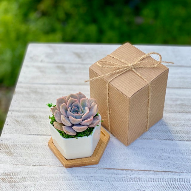 Potted succulent in ceramic pot with bamboo tray and kraft gift box.